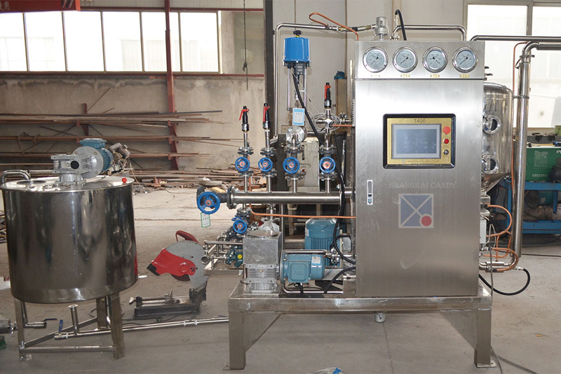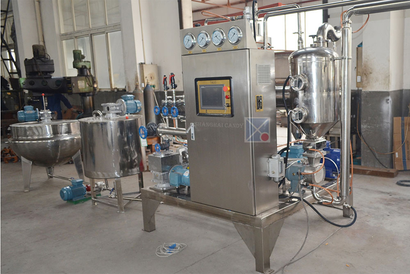 高速真空熬糖機由PLC控制系統、糖漿定量泵、薄膜蒸發器、真空式水環真空泵、卸料泵、溫度壓力等測量儀表及電器控制箱等部分組成,所有組成都安裝在同一機架上,并通過各種管道閥門連接起來。該機組具有連續生產產量高、熬糖質量好、操作簡便等特點,是理想的軟糖熬糖設備。