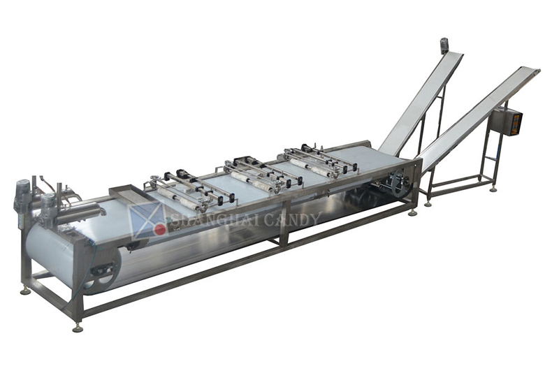 該生產線主要由真空熬糖機、保溫輥床、勻條機、棒糖成型機、輸送機、5層冷柜等組成。該生產線結構緊湊、占地面積小、性能可靠、廢料少、生產效率高。整條生產線按標準制造,符合食品衛生要求。此生產線可添加連續薄膜熬糖機和冷卻鋼帶實現全自動化生產。