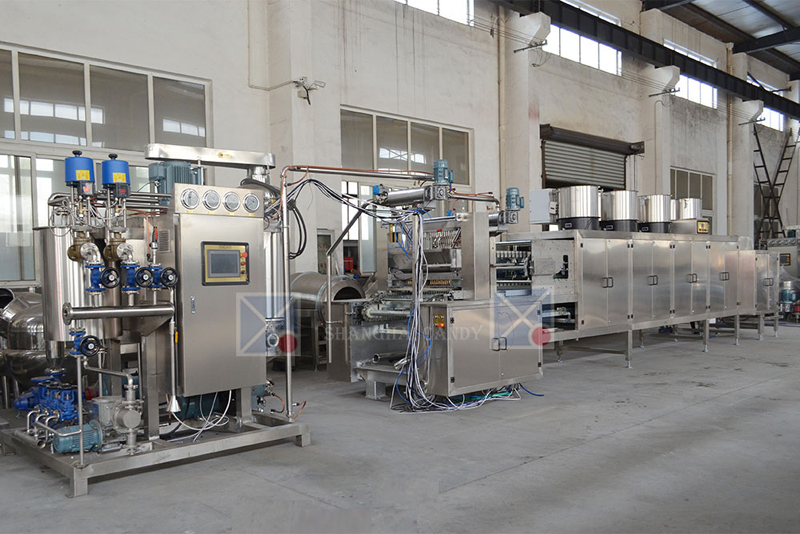SGD500B全自動PLC控制連續棒糖澆注生產線是目前生產澆注棒糖的設備。這條生產線由自動稱重(選配),壓力化糖鍋,薄膜熬糖機,澆注機,插棒系統,脫模系統和冷柜等組成。這條生產線具有以下優點:高產量,澆注準確,插棒準確率高,插棒位置精準。此生產線生產的棒糖外表漂亮,口感很好。